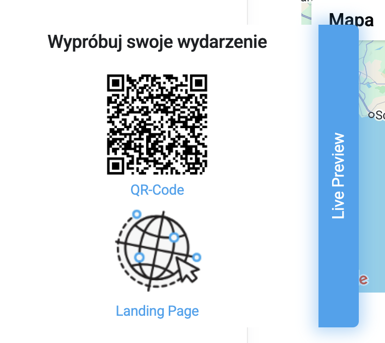 Want to see how your event page and app look right now? In the admin panel, on the left side in the sliding LIVE PREVIEW, you'll find a link to the Landing Page and a QR code for the mobile app.