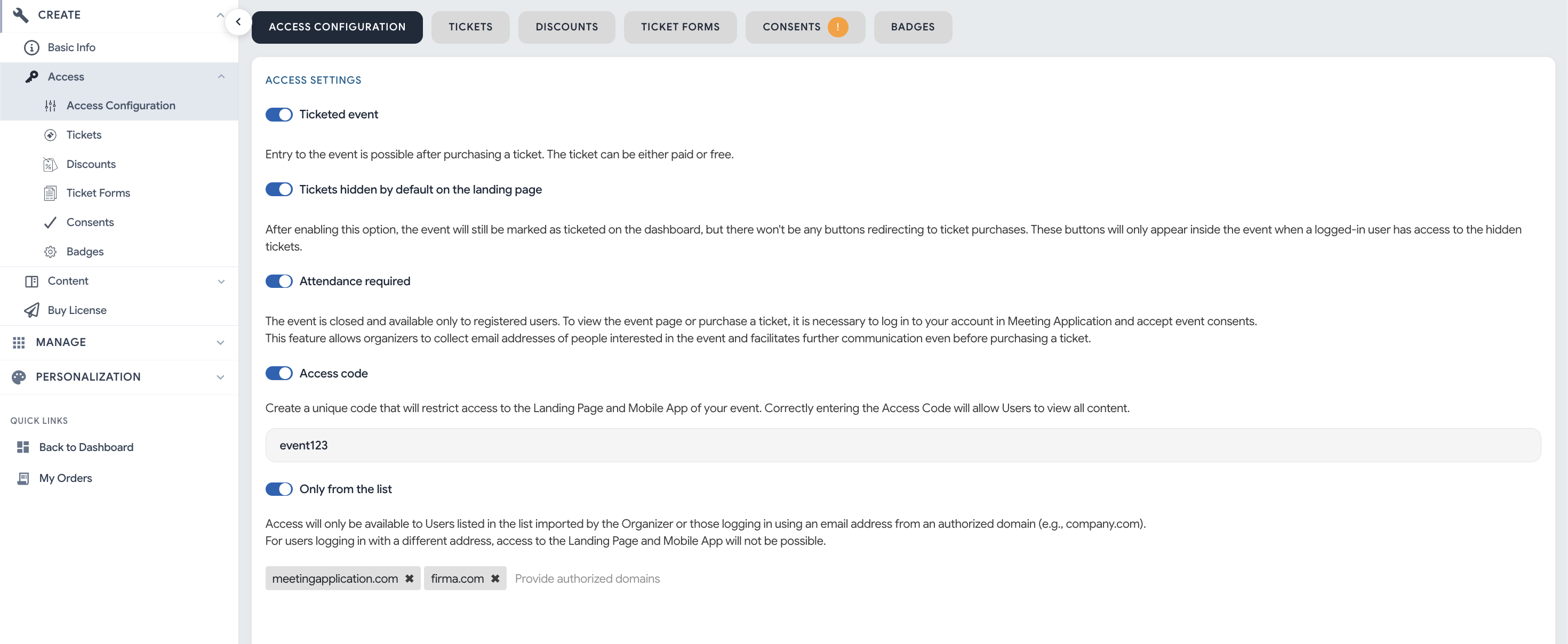 Attention! When the event is not published yet, a maximum of 5 users can access it. Even if access to the event is set to Disabled, people joining the event demo have to be logged in so that they show up on the USERS list in the MANAGE tab.