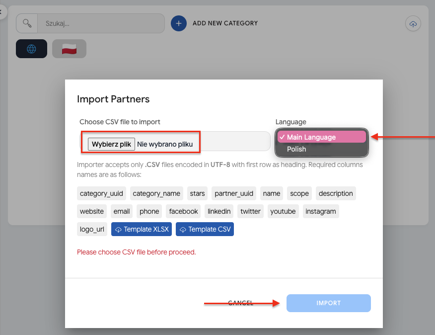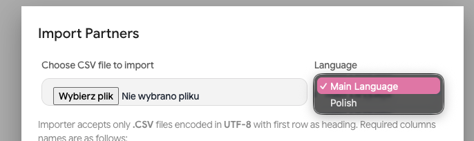 To import another language layer in the Sponsors/Partners module, you need to prepare a new csv file in which the data from the category_name, name, scope and description columns will be translated. The data in the remaining columns must stay unchanged compared to the previously imported layer. Partner profiles in both files should have the same order. UUID numbers assigned to categories (category_uuid) and to the partner profile (partner_uuid) should stay the same in all imported files/layers.