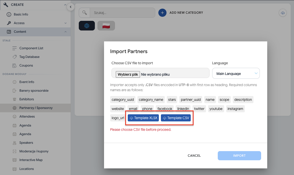 You can add your event’s partners and sponsors to the Partners/Sponsors module in two ways. One by one via the admin panel (you can learn more about adding partners and sponsors in the article Partners and Sponsors) or by importing all sponsors using a bulk file. This article explains how to correctly create a file with data of all partners and how to import it into your event.
