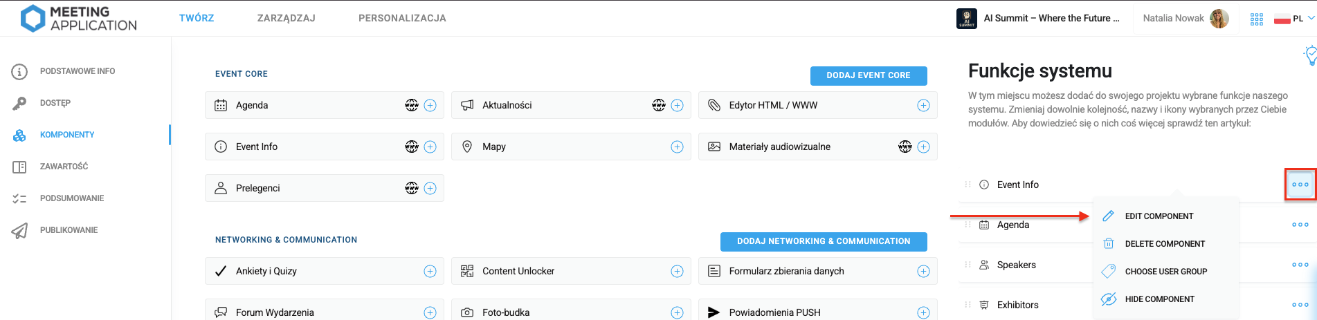 Add the Event info component from the modules list in the CREATE → COMPONENTS tab. The component is automatically filled in with details from the Basic Info tab.