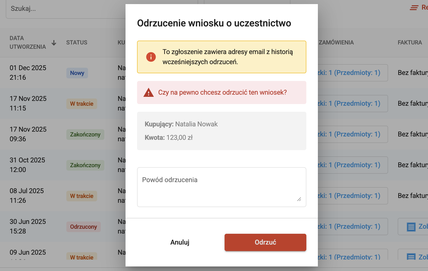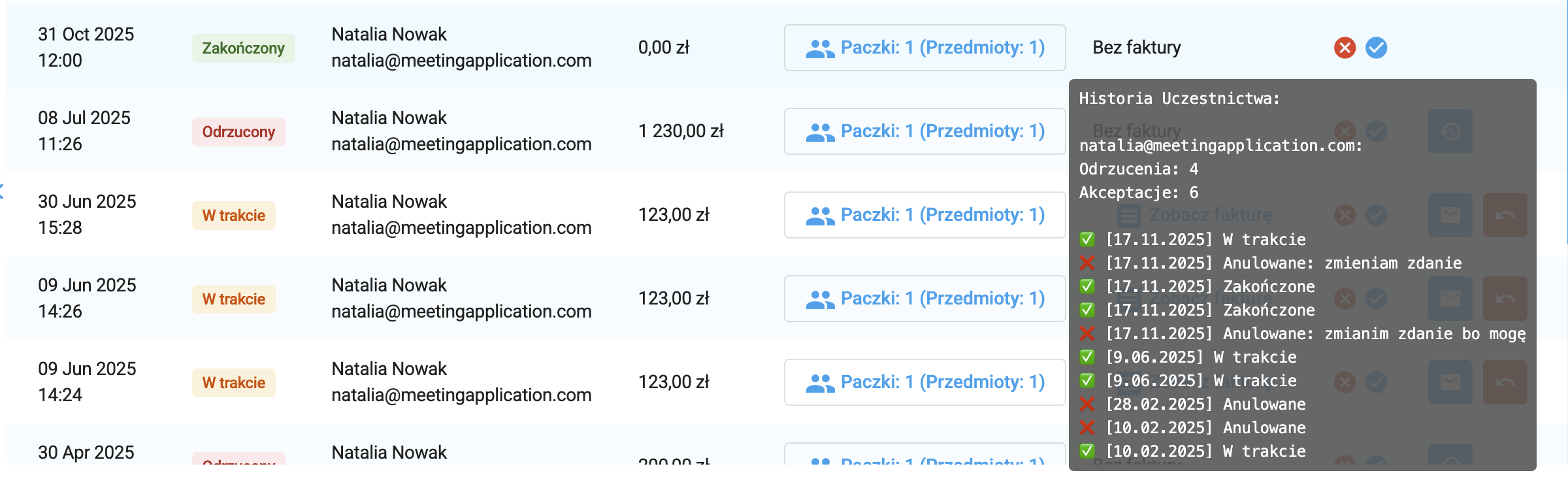 In the MANAGE → PARTICIPATION REQUESTS tab, there's an extensive history of submissions, thanks to which you can check at any time all actions taken for a given email address. When you hover over the icon in the History column, the system displays a full activity log: all acceptances, rejections, cancellations, and additional notes left by administrators. This way, you get instant insight into the participant's previous submissions and can make informed decisions about further processing.