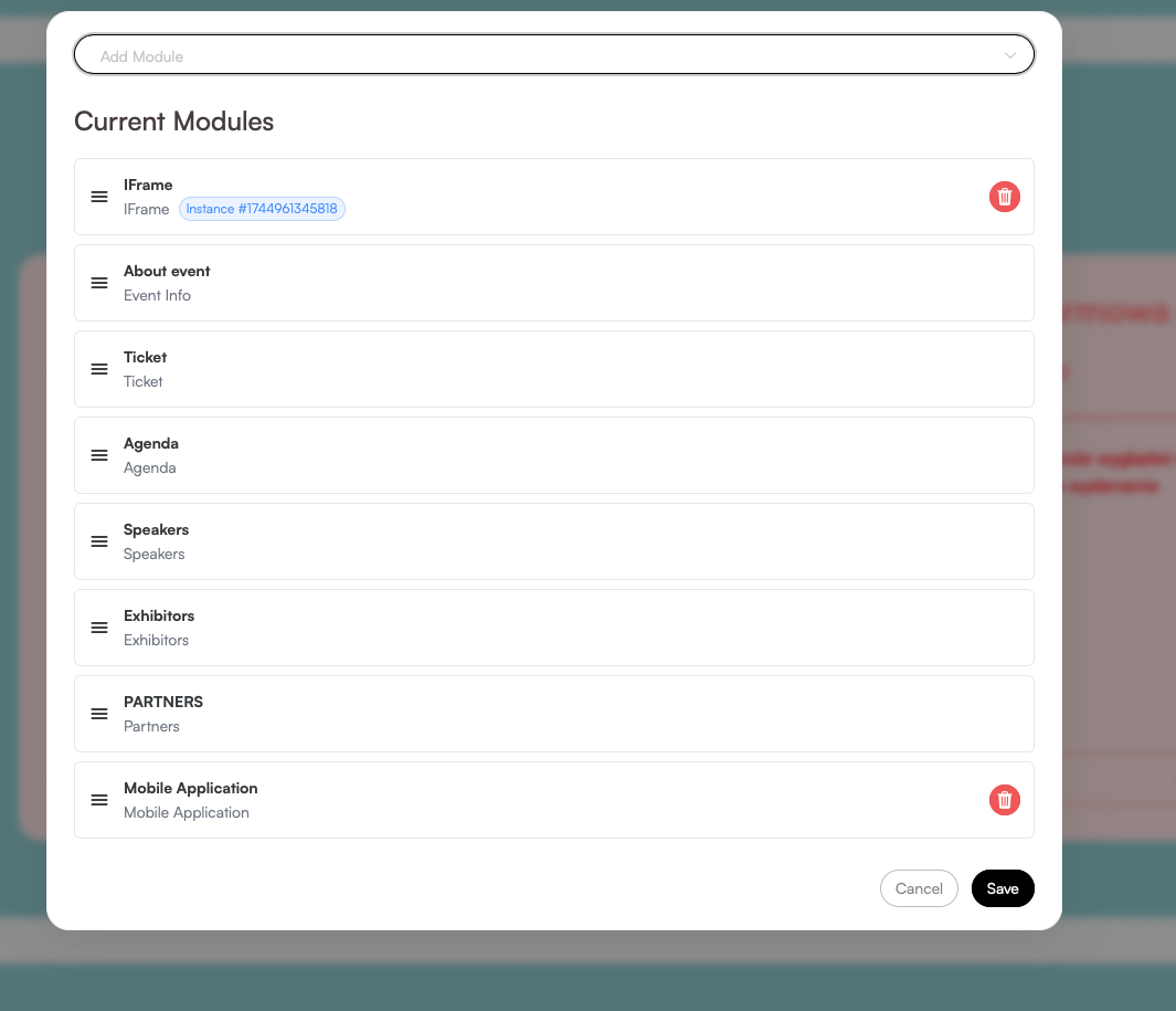 You can now change the order of modules visible on the Landing Page. This option is available in the Landing Page editor. It lets you add 3 new modules: iFrame, Partners & Sponsors, and Mobile App