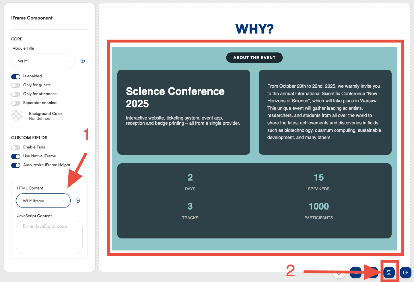 Then from the list I pick WHY iframe (1) and now the HTML code I added in the previous step will show up on the site. Click Save (2) to save your new module configuration on the Event Page.