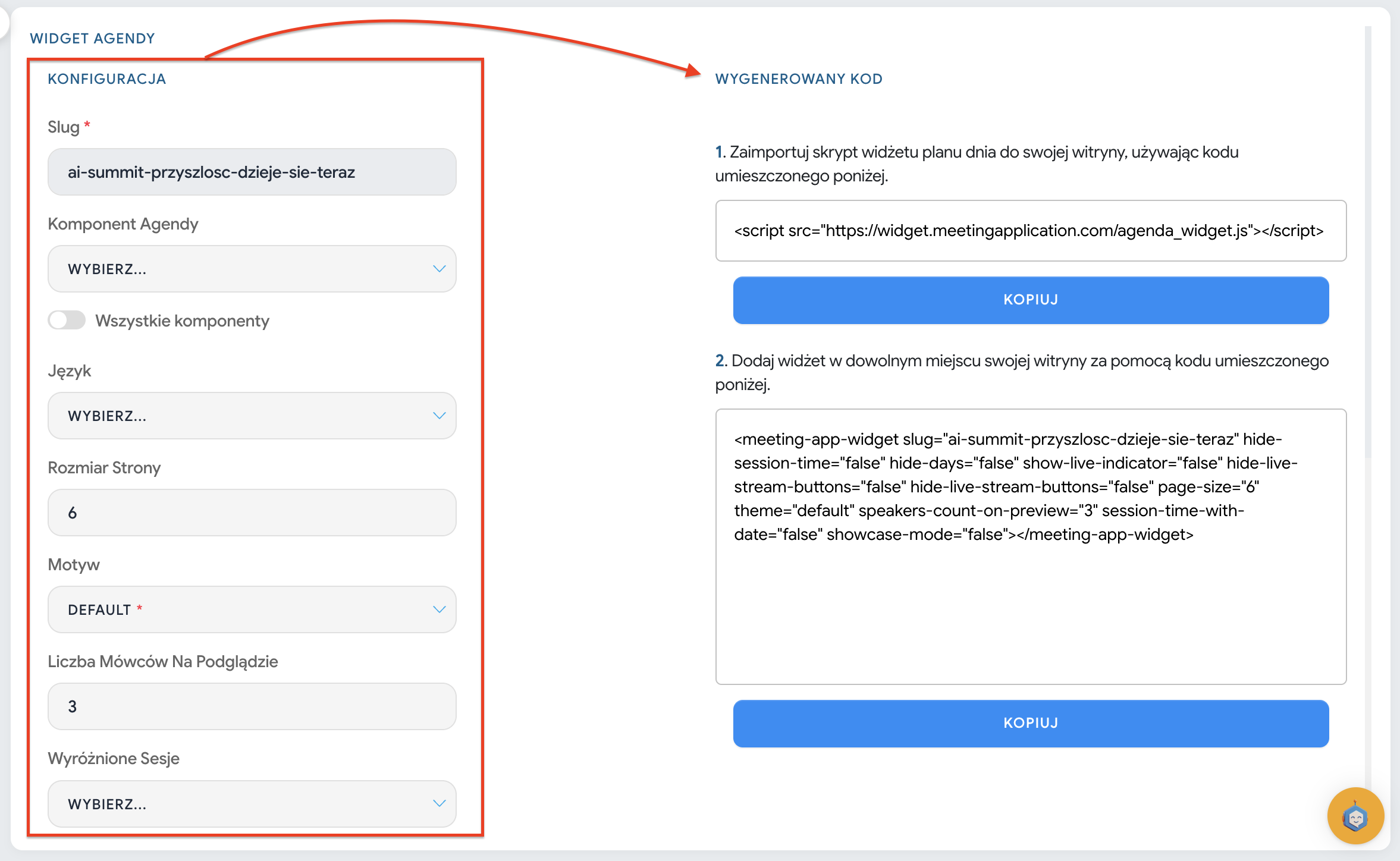 if you fine-tune the configuration (e.g. hiding hours, page size, LP mode) — copy the ready code and keep it on your side (e.g. in a file / document / notes),