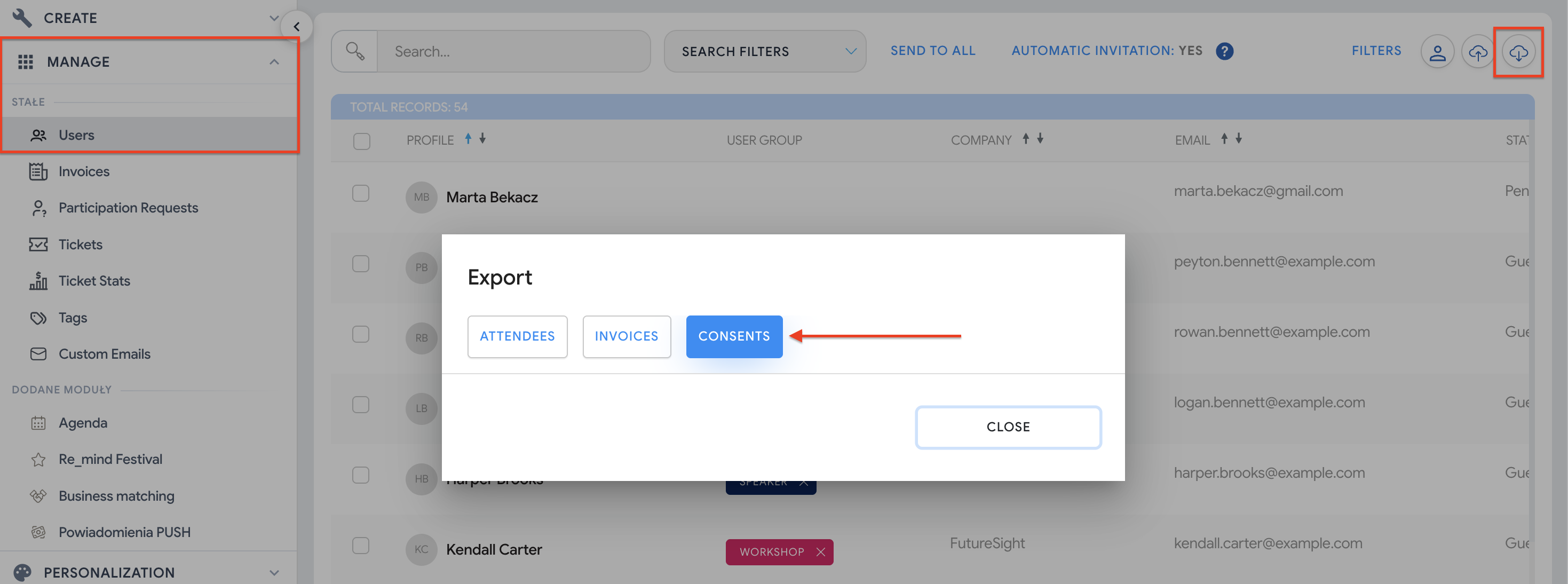 System wersjonuje zgody, gromadząc informację o tym na którą wersję regulaminu dany użytkownik wyraził zgodę podzczas rejestracji lub dołączania do twojego wydarzenia. Wszystkie informacje znajdziesz w wyeksportowanym z zakładki ZARZĄDZAJ → UŻYTKOWNICY → EKSPORT ZEBRANYCH DANYCH → ZGODY pliku.