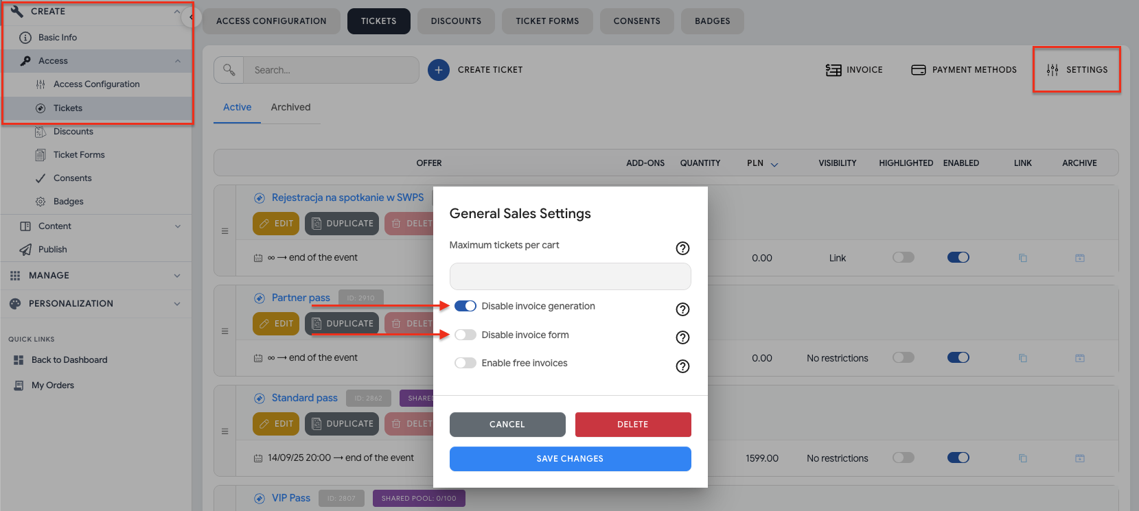 Możliwość zbierania danych do faktury bez wystawiania dokumentów pdf przez Meeting Application: wystarczy, że w zakładce TWÓRZ → DOSTĘP → BILETY → Ustawienia, przełączysz odpowiedni switch, a system nie będzie generował dokumentów pdf.