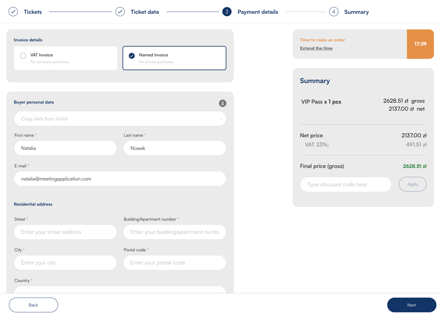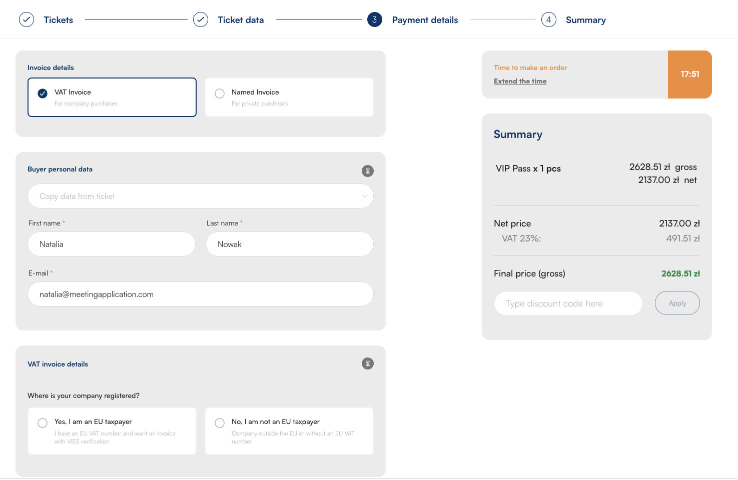 Faktura VAT (B2B): Przeznaczona dla firm i instytucji. Kupujący musi podać numer NIP oraz pełne dane spółki. System Meeting Application jest zintegrowany z bazą VIES, co pozwala na automatyczne zaciągnięcie danych po wpisaniu NIP, minimalizując ryzyko błędów.