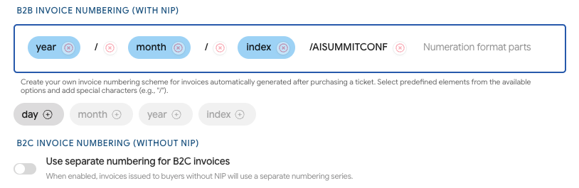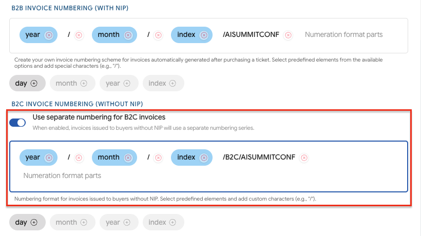 Chcesz, aby faktury imienne posiadały odrębną numerację? Przełącz switch “osobna numeracja dla faktur B2C” i ustal dedykowany format, dokładnie w ten sam sposób jak numeracja B2B.