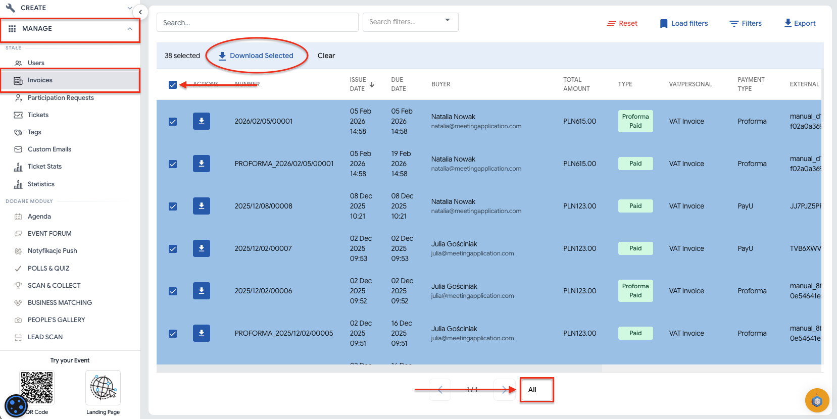 Aby pobrać paczkę faktur wystawionych dla uczestników Twojego wydarzenia, wejdź w zakładkę ZARZĄDZAJ → FAKTURY.