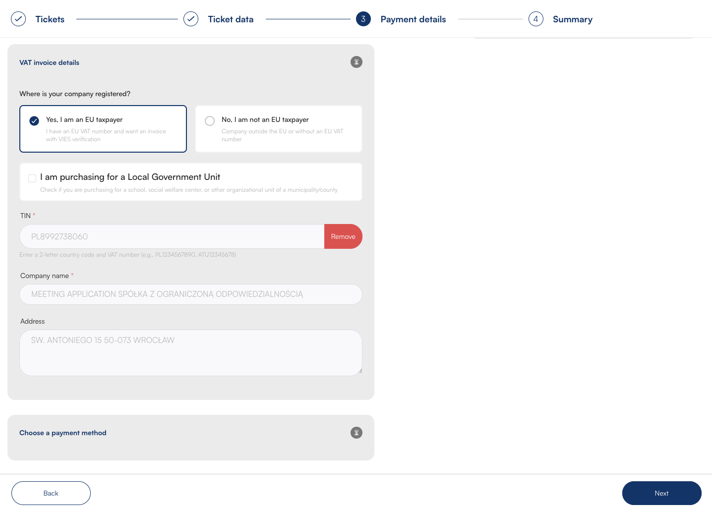 Ważne: Podatnicy UE i Jednostki Samorządu Terytorialnego (JST). Zgodnie z unijnymi regulacjami prawnymi, system umożliwia zakup biletów przez podmioty publiczne. Wybór opcji, czy firma jest zarejestrowana na terenie Unii Europejskiej, jest kluczowy, aby umożliwić zakup m.in. szkołom czy urzędom działającym jako JST. W takim scenariuszu kupujący może wskazać odrębne dane dla Płatnika (np. Gmina/Powiat) oraz Odbiorcy (np. konkretna szkoła), co jest niezbędne dla zachowania poprawności schemy XML w KSeF, a także dla rozliczenia dokumentu przez szkołę.