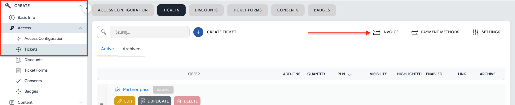 Ścieżka: TWÓRZ > DOSTĘP > BILETY > Faktura