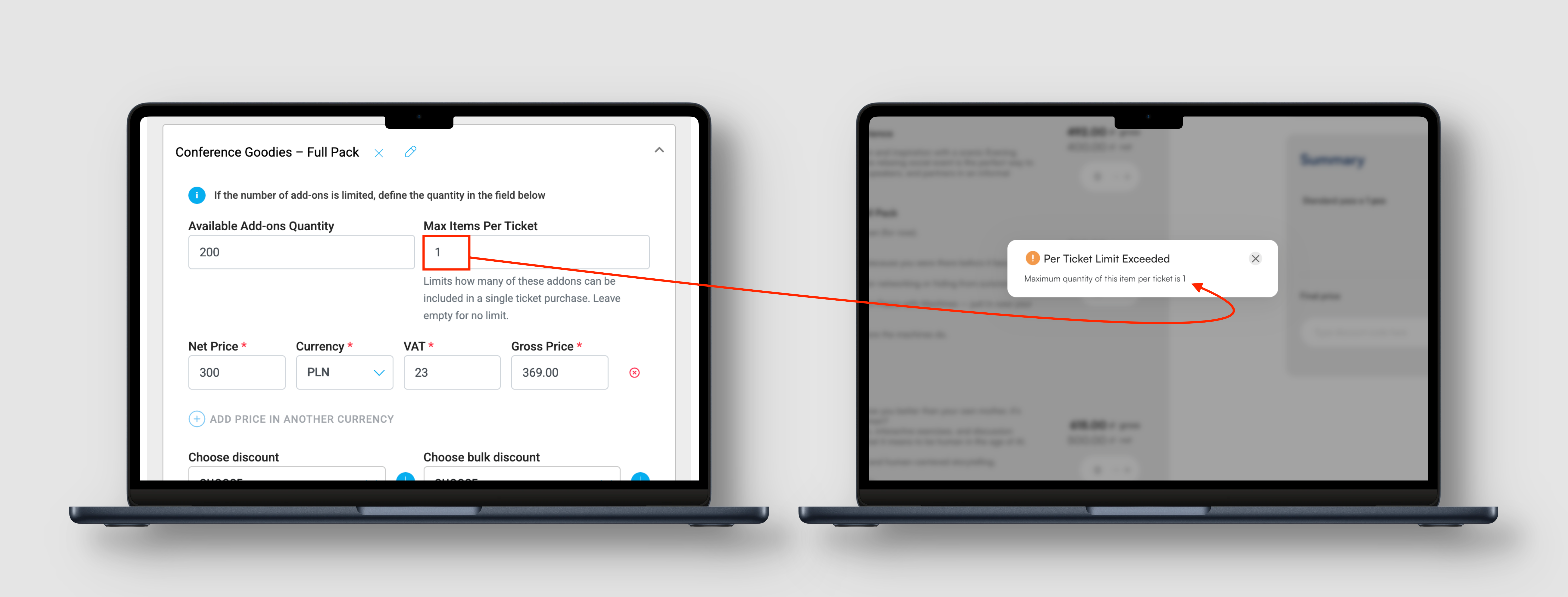 Limit dodatków – wspólna pula ilościowa, która kontroluje maksymalną sprzedaż dodatku niezależnie od tego z iloma biletami będzie sprzedawany. Sprzedajesz książkę jednego z prelegentów i masz tylko 50 egzemplarzy? WŁĄCZ LIMIT DODATKÓW aby mieć pewność, że nie sprzedasz większej ilości kopii.