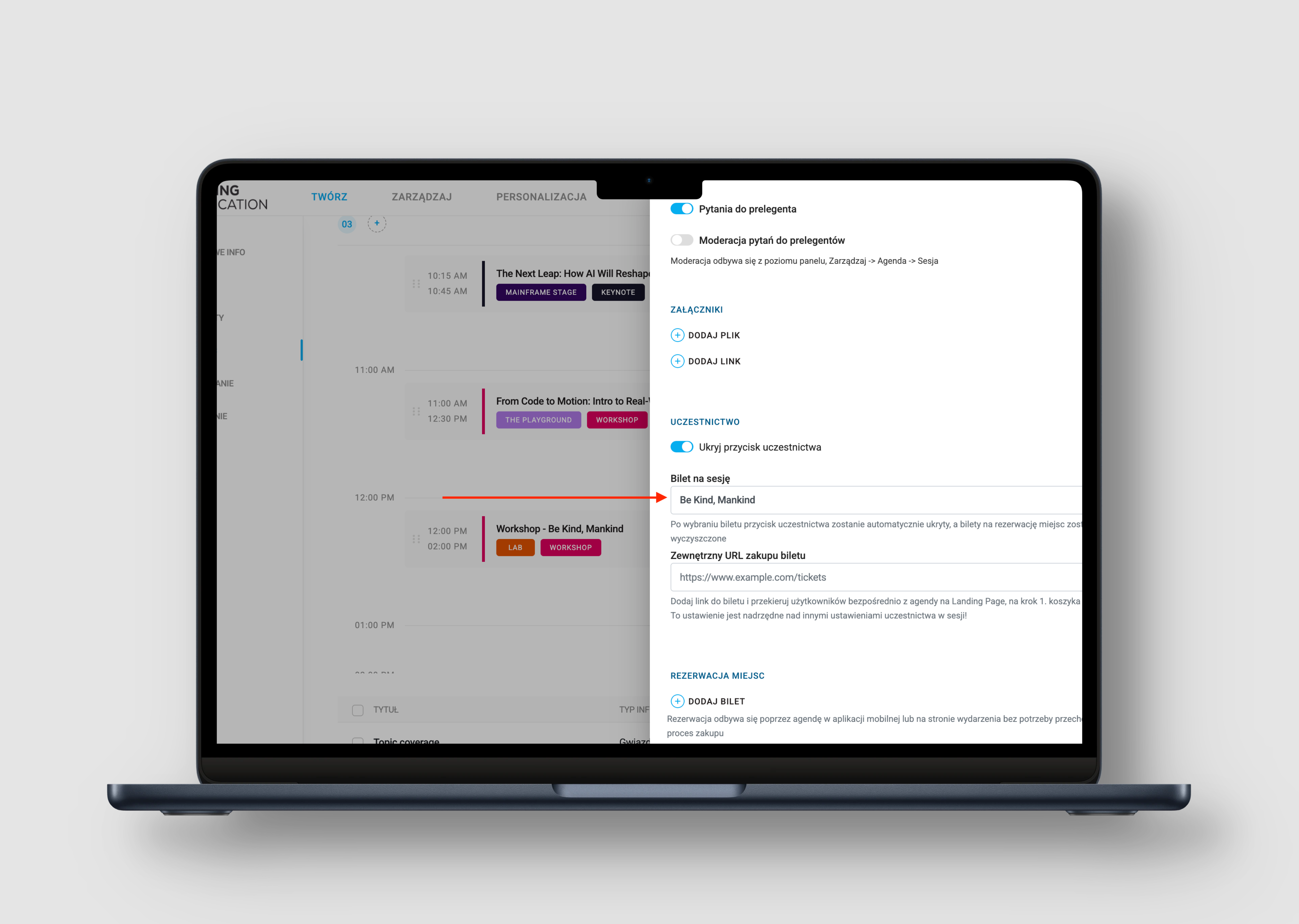 Często podczas tworzenia biletów nie ma jeszcze pewności co do daty czy konkretnej sali, w której odbędzie się warsztat. Dlatego na etapie tworzenia biletów warto odpowiednio nazwać dodatek, np Warsztat z John Doe, a bliżej terminu wydarzenia dodać w agendzie konkretną sesję i połączyć sprzedawany bilet z sesją agendy.