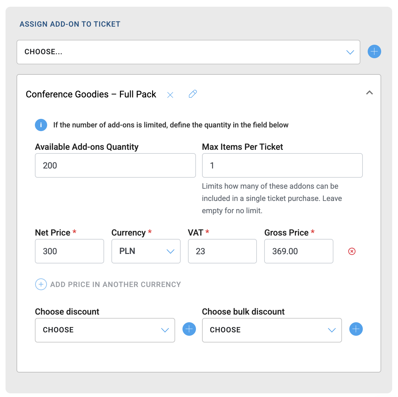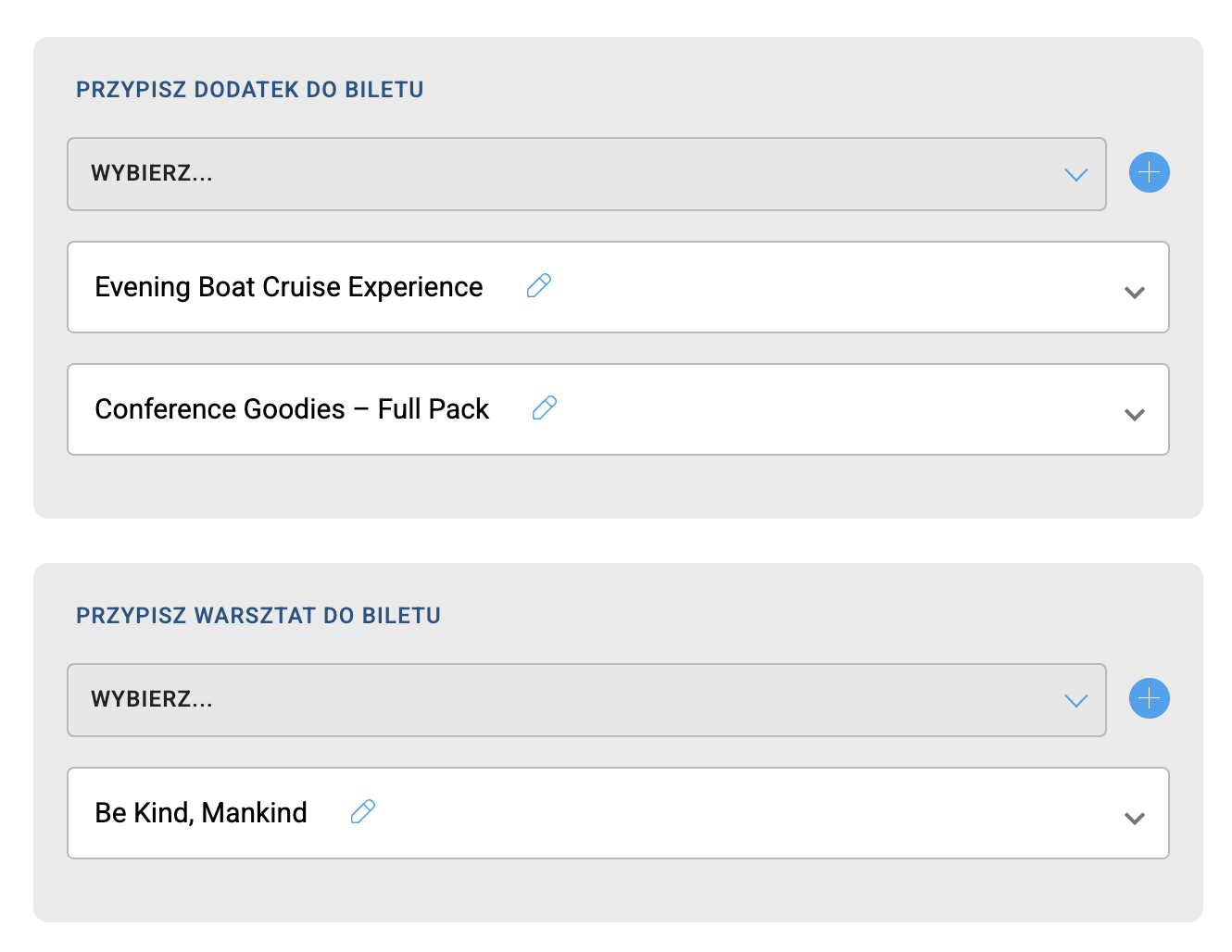 Po stworzeniu dodatku, w sekcji przypisz dodatek do biletu lub przypisz warsztat do biletu wybierz z listy dodatek i dostosuj ustawienia do biletu.
