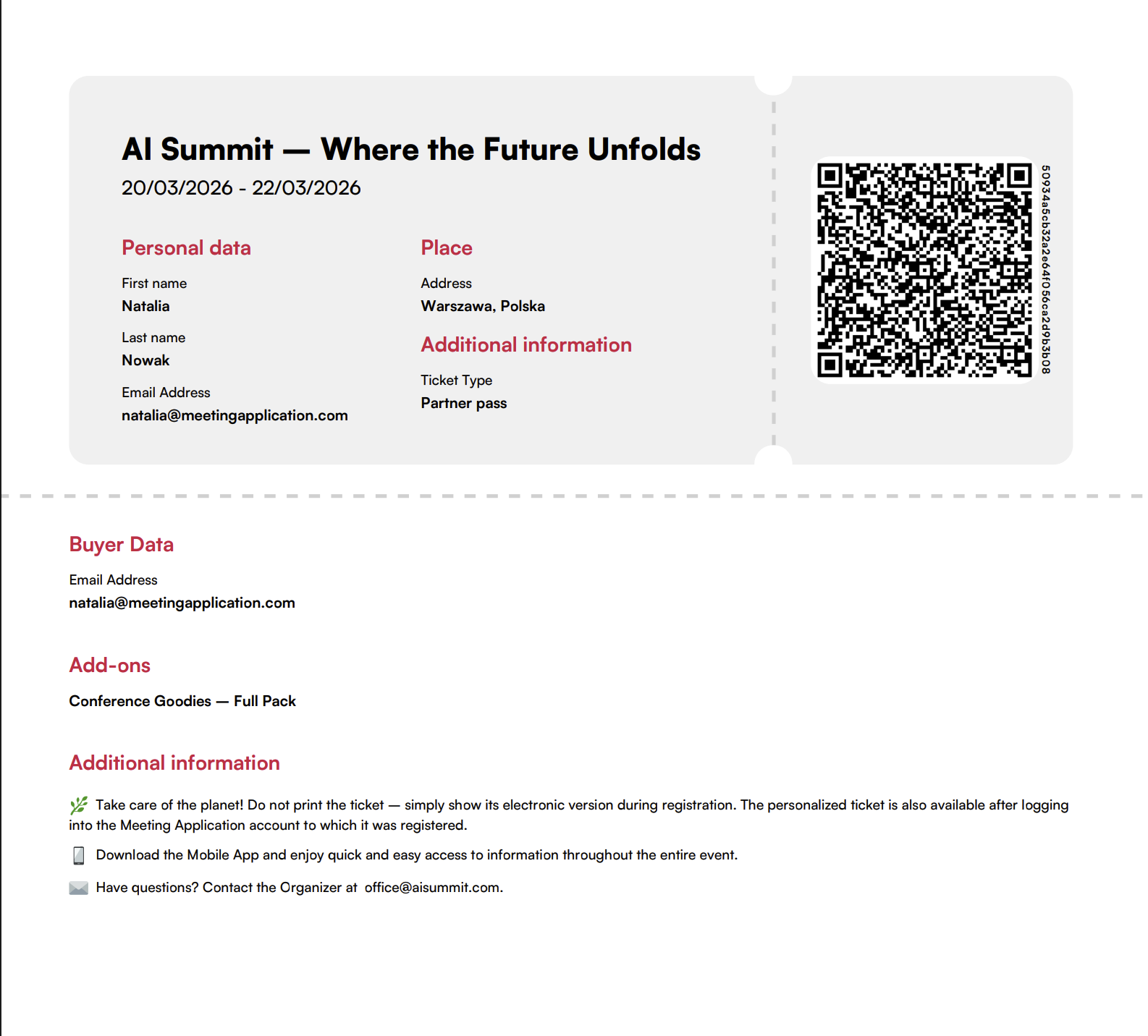 Zakupiony dodatek będzie wyszczególniony na bilecie pdf wysyłanym na maila oraz dostępnym po zalogowaniu się adresem e-mail posiadacza biletu na landing page i w aplikacji mobilnej