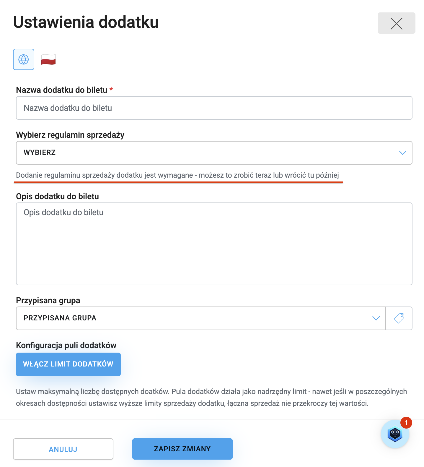 Na etapie konfiguracji dodatku warto już mieć dodany regulamin sprzedaży biletów i/lub regulamin sprzedaży dodatków, aby podpiąć dokument, który uczestnicy będą akceptować.
