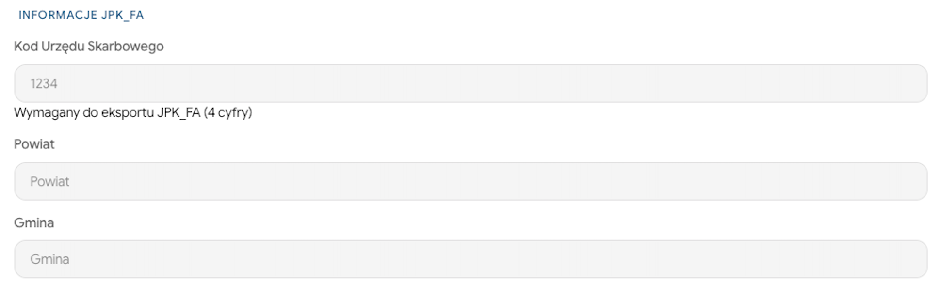 W sekcji Informacje JPK_FA wpisz czterocyfrowy kod urzędu skarbowego, a także powiat i gminę.