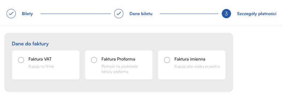 Opcja Pro-forma: Jeśli organizator skonfigurował tę metodę, kupujący może wybrać fakturę pro-forma jako dokument potwierdzający zamiar zakupu na firmę (wymagany NIP)