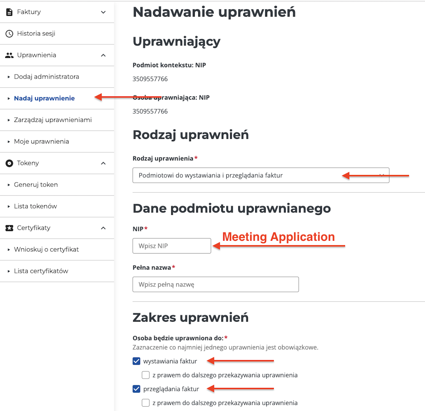 Aby Meeting Application mógł automatycznie wysyłać Twoje faktury do rządowego systemu i odbierać ich numery identyfikacyjne, musisz zalogować się do KSeF i nadać odpowiednie uprawnienia dla Meeting Application. .