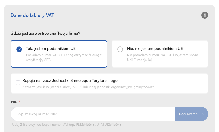 Firma (B2B): Kupujący podaje NIP. System umożliwia automatyczne zaciągnięcie danych z bazy VIES, co minimalizuje ryzyko błędów. W przypadku wyboru Faktury VAT (B2B), kolejnym krokiem jest wybór:
