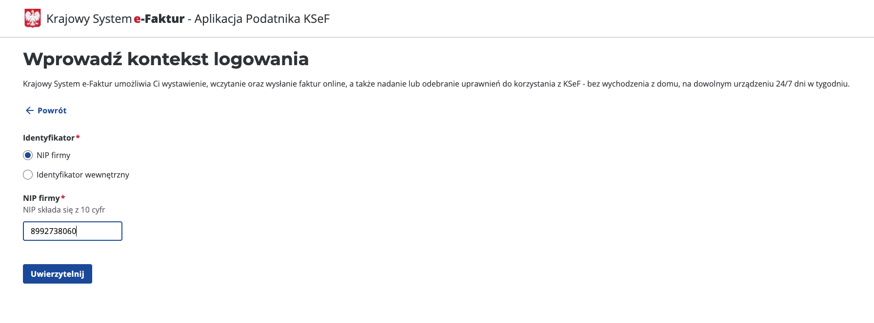 Wybierz opcję „Uwierzytelnij się w Krajowym Systemie e-Faktur”.