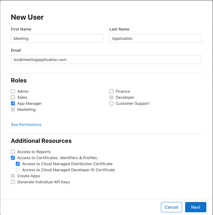 ios@meetingapplication.com został już wcześniej dodanyNie trzeba tworzyć go ponownie. Wystarczy wejść w Users and Access → People, otworzyć konto użytkownika ios@meetingapplication.com, a następnie zaktualizować jego rolę, dodatkowe uprawnienia i — jeśli Apple na to pozwala — dostęp do aplikacji przez Manage Apps.